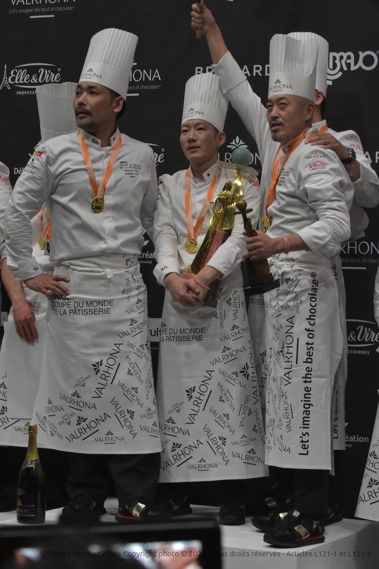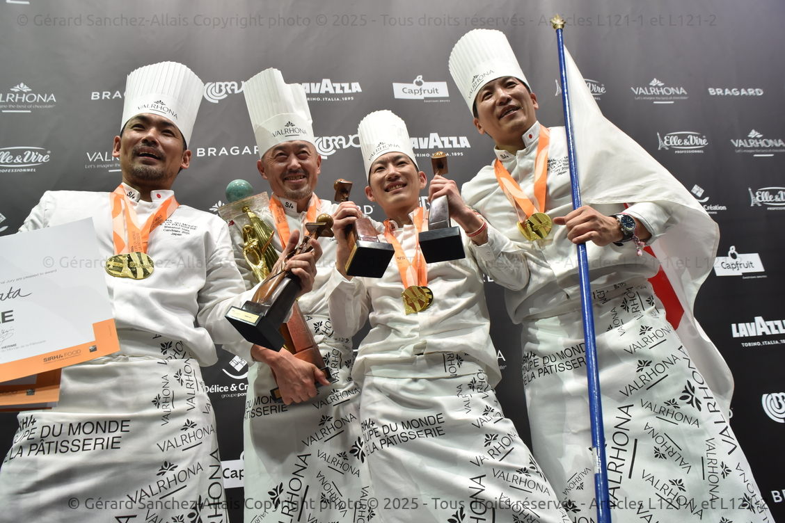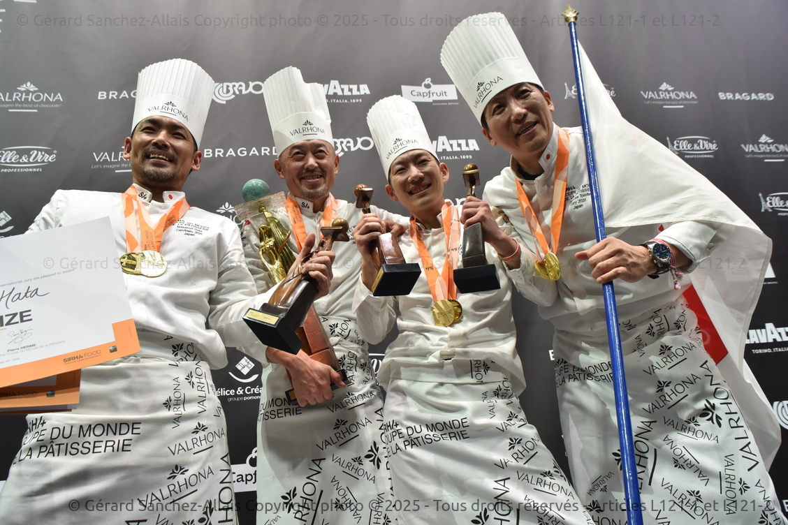Avec 14026 points, l’équipe japonaise, composée de Masanaori HATA (Chocolat), Yuji MATOBA (Sucre), et Ryu MIYAZAKI (Glace) a remporté la Coupe du Monde de la Pâtisserie, qui avait lieu à Lyon, pendant le Sirha, du 24 au 25 janvier 2025, devant la France (13621 points) et la Malaisie (11696 points).